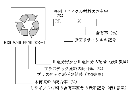 木材・プラスチック再生複合材の表示マーク例